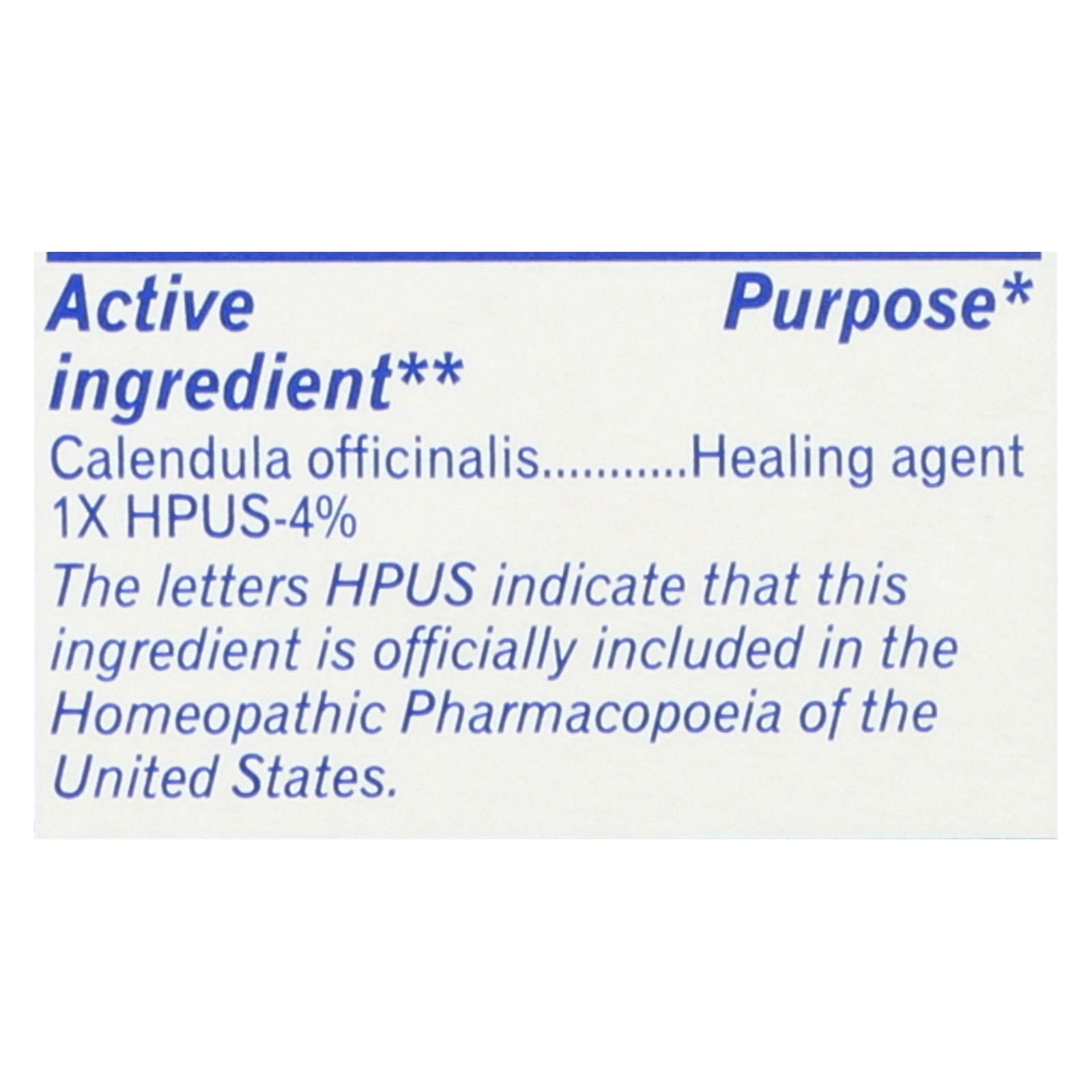 ingredients : active ingredient** calendula officinalis purpose* healing agent 1x hpus-4% the letters hpus indicate that this ingredient is officially included in the homeopathic pharmacopoeia of the united states;inactive ingredient white petrolatum nf