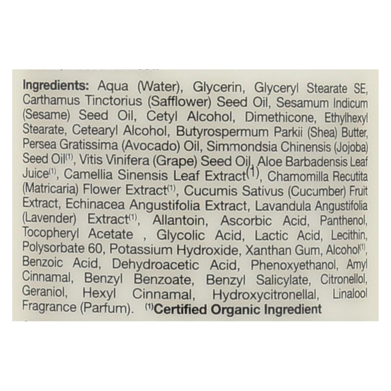 ingredients : aqua;water;glycerin;glyceryl stearate se;carthamus tinctorius;safflower;seed oil;sesamum indicum;sesame;cetyl alcohol;dimethicone;ethylhexyl stearate;cetearyl alcohol;butyrospermum parkii;shea;butter;persea gratissima;avocado;oil;simmondsia chinensis;jojoba;seed oil⁽¹⁾;vitis vinifera;grape;aloe barbadensis leaf juice⁽¹⁾;camellia sinensis leaf extract⁽¹⁾;chamomilla recutita;matricaria;flower extract⁽¹⁾;cucumis sativus;cucumber;fruit extract;echinacea angustifolia extract;lavandula angustifolia;la