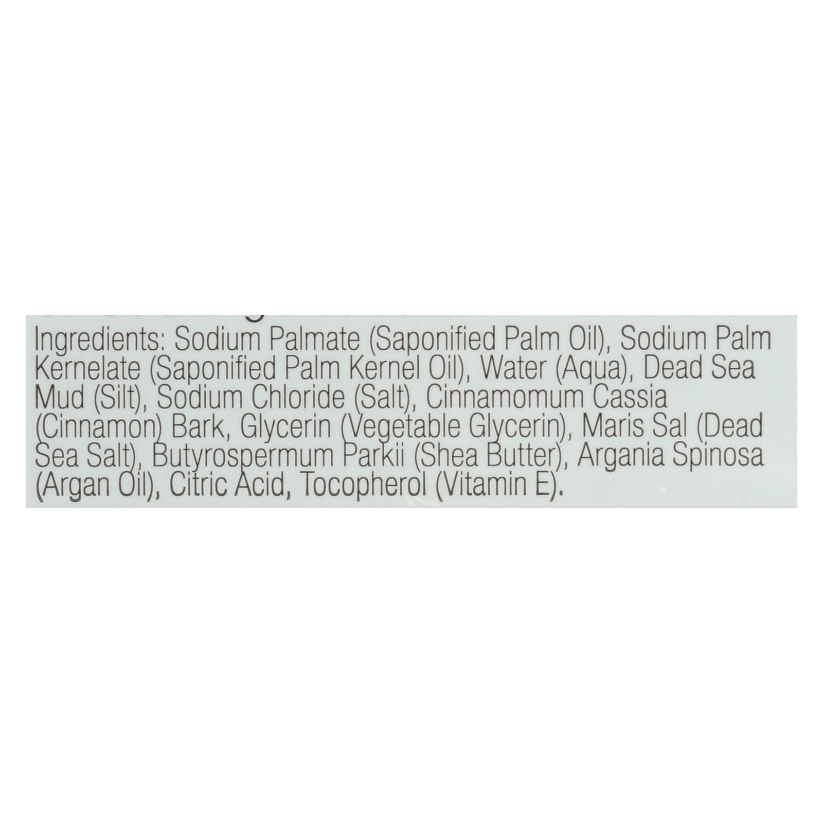 ingredients : sodium palmate;saponified palm oil;sodium palm kernelate;saponified palm kernel oil;water;aqua;dead sea mud;silt;sodium chloride;salt;cinnamomum cassia;cinnamon;bark;glycerin;vegetable glycerin;maris sal;dead sea salt;butyrospermum parkii;shea butter;argania spinosa;argan oil;citric acid;tocopherol;vitamin e